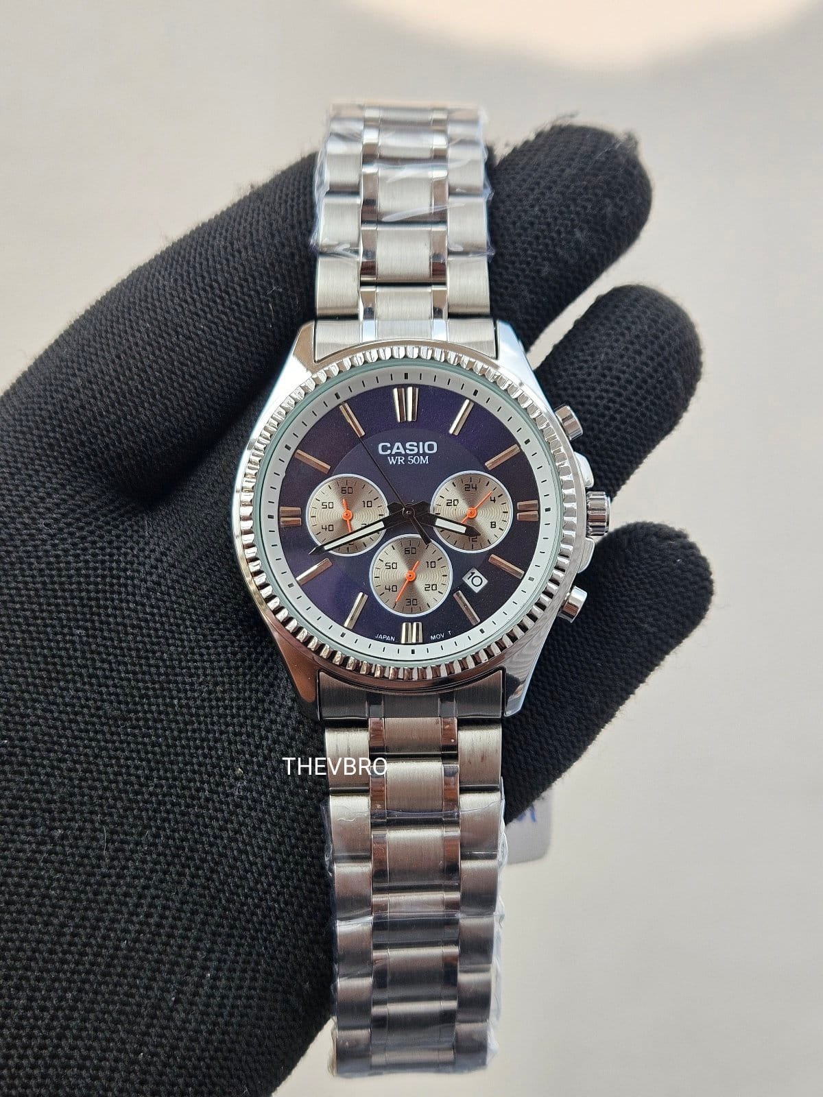This stylish Casio WR 50M–style chronograph watch brings a premium look with its deep blue dial and stainless steel strap.