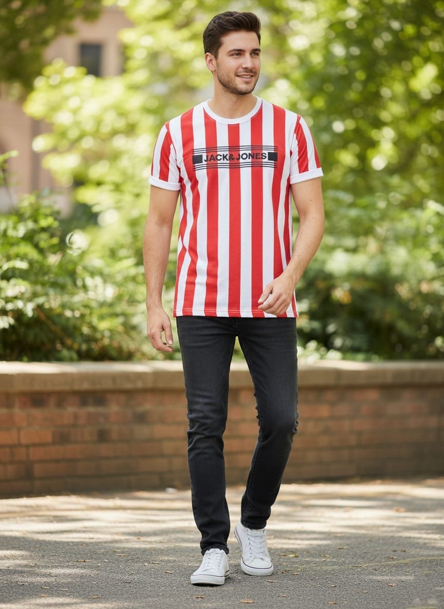 This Jack & Jones t-shirt is a bold and modern piece that stands out with its striking red and white vertical stripes. The design is complemented by a clean, horizontal black bar featuring the ‘JACK & JONES’ logo, creating a dynamic contrast. The classic crew neck and half sleeves are finished with a solid white trim, enhancing the crisp look.