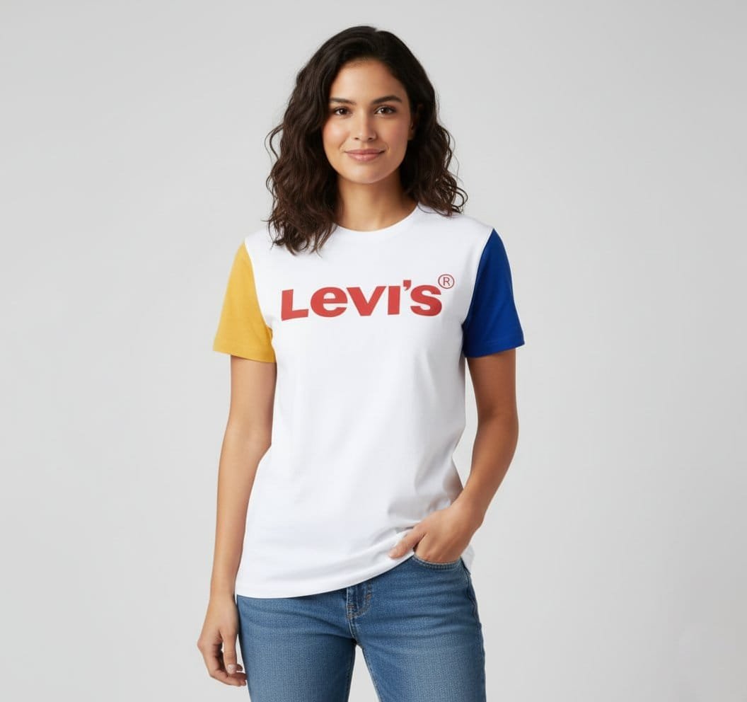 This Levi’s t-shirt features a clean white body with a red logo print and contrasting mustard yellow and royal blue color-blocked sleeves.