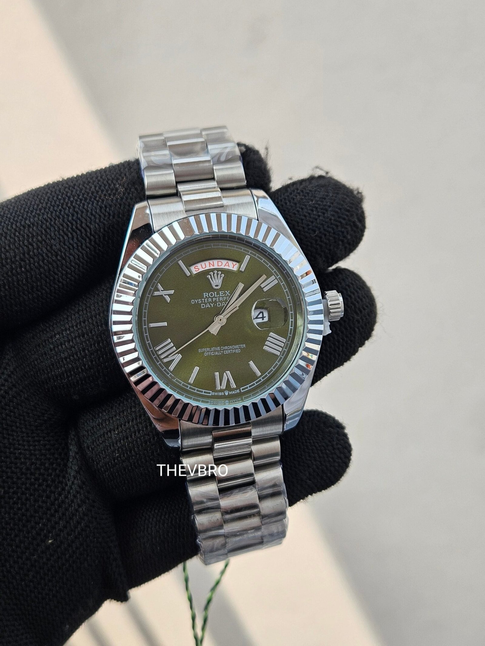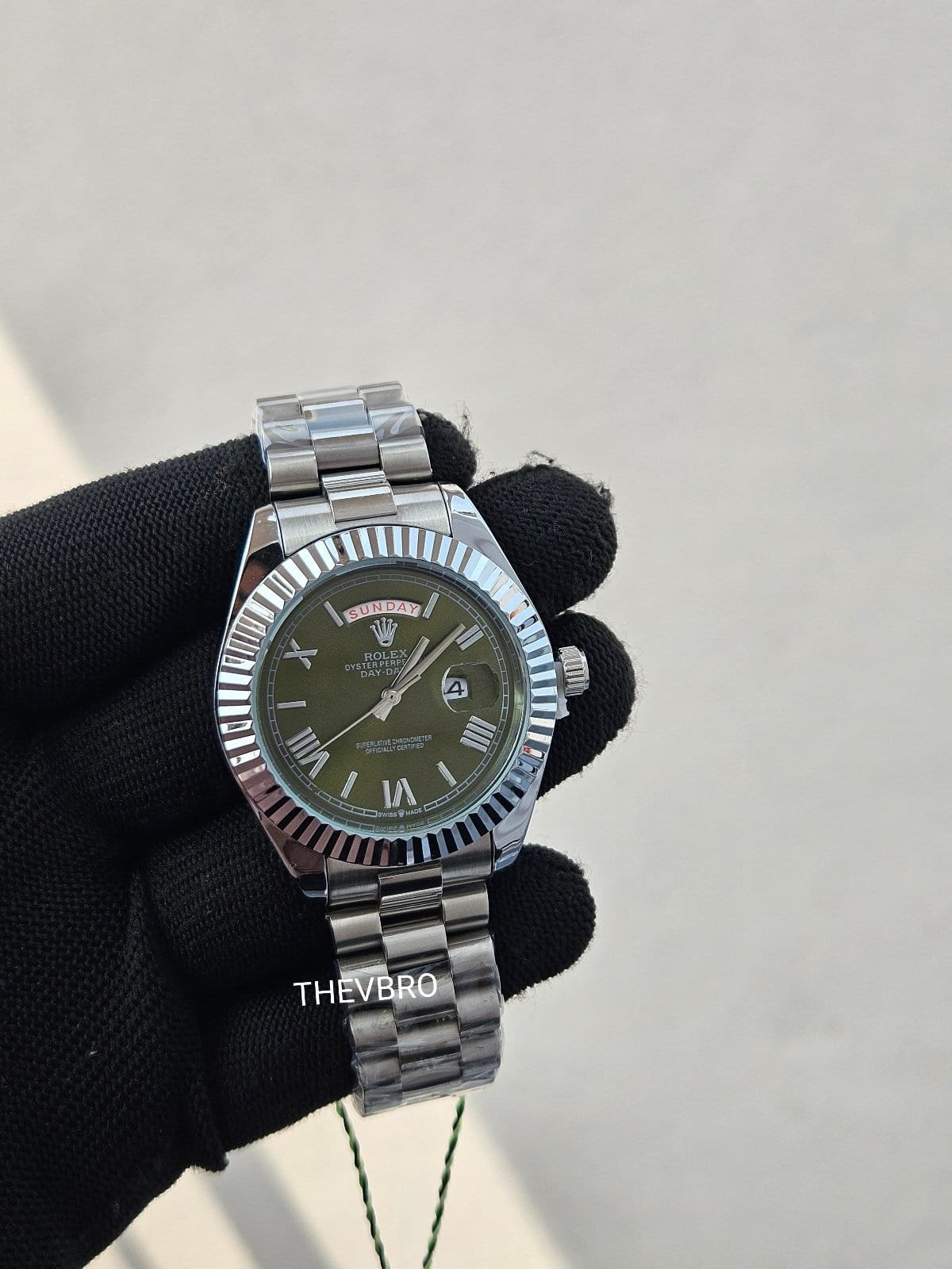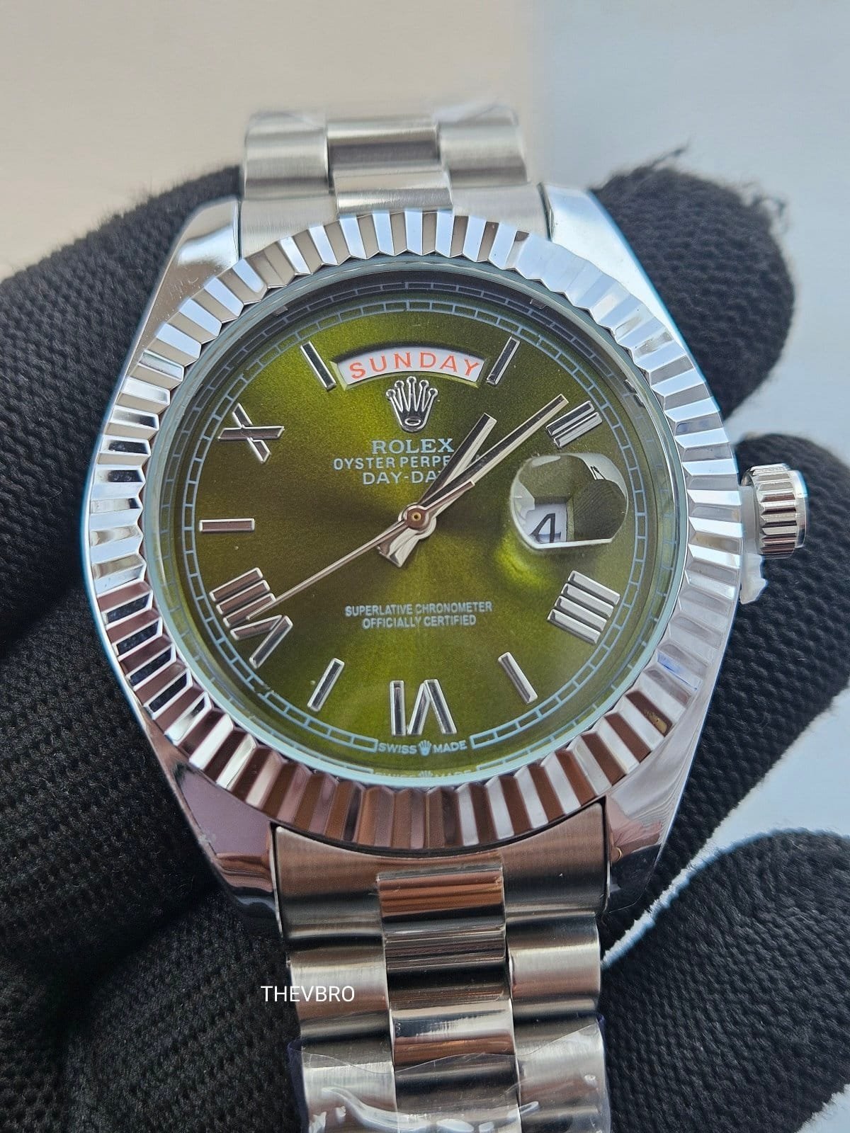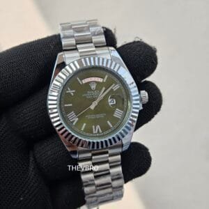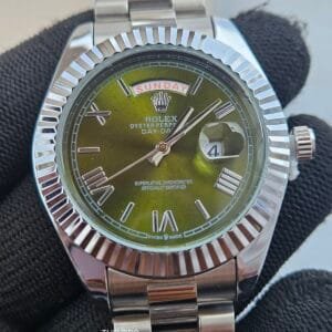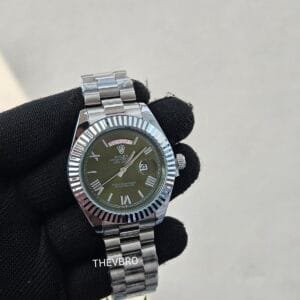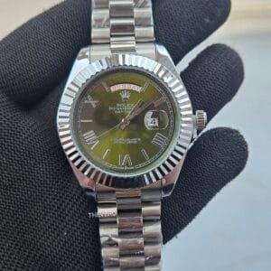 This elegant Rolex Oyster Perpetual Day-Date–style men’s watch comes in 7A premium quality, featuring a unique olive-green dial paired with a polished stainless steel bracelet.