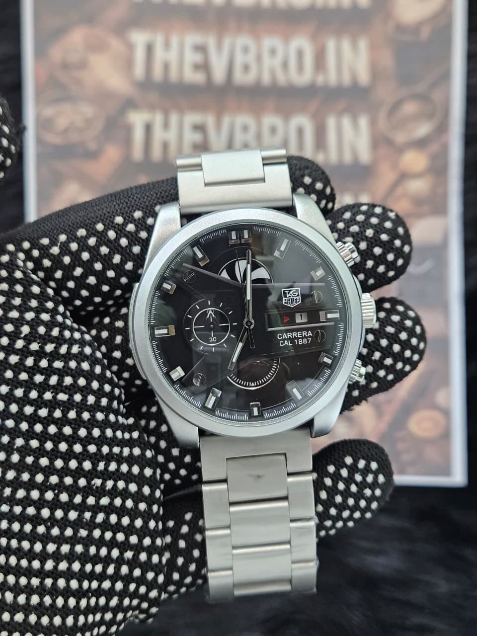 The silver steel body paired with a black Carrera-style dial gives it a modern, sporty, and luxurious appearance.