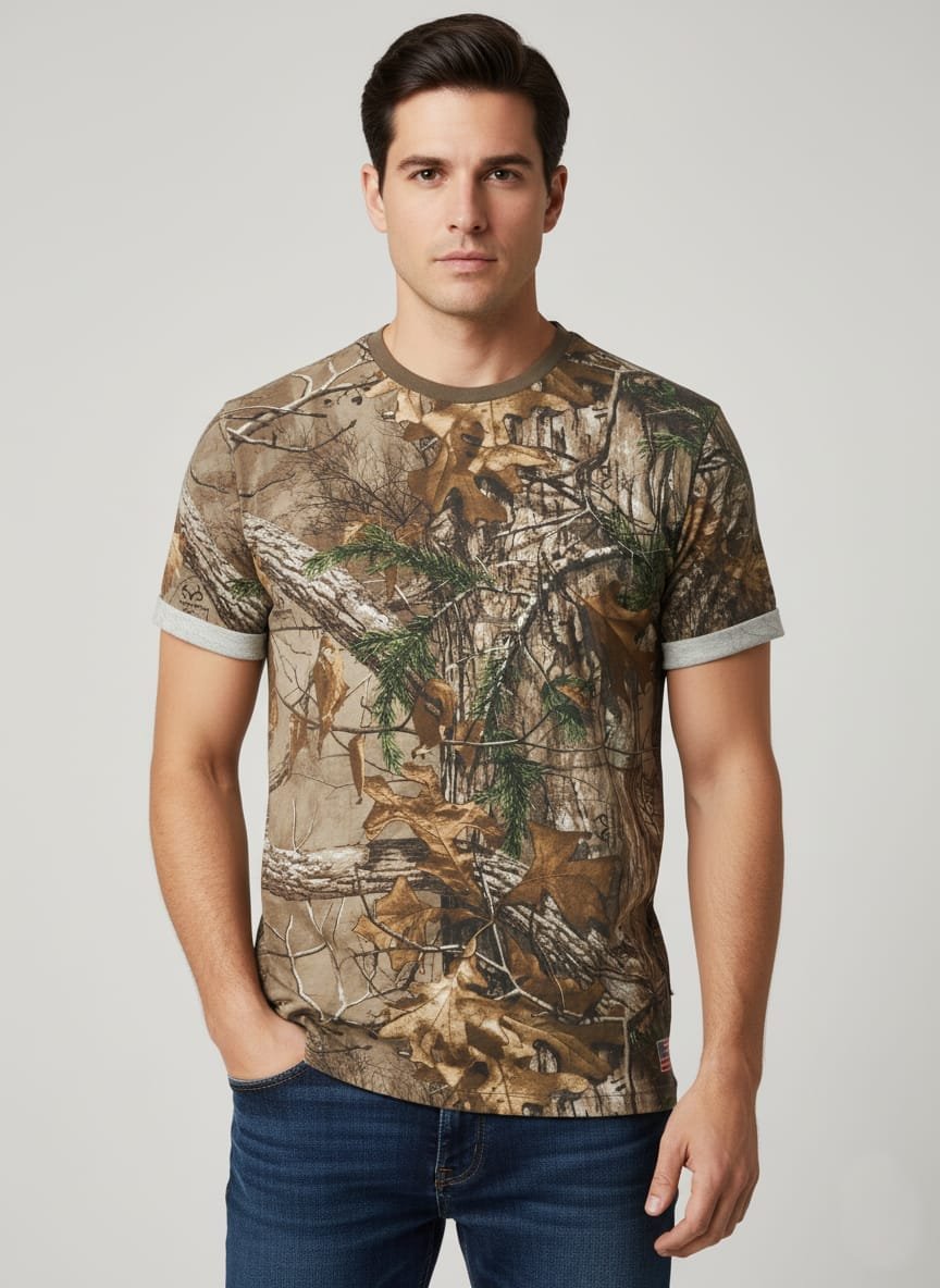 This U.S. Polo Assn. t-shirt is a stylish take on a classic outdoor-inspired print. It features an all-over, realistic camouflage pattern with earthy tones of brown, green, and tan, mimicking tree bark and leaves. The classic round neck is finished with a solid brown trim, and the half sleeves are cuffed with a contrasting gray melange fabric, adding a modern and unique detail.
