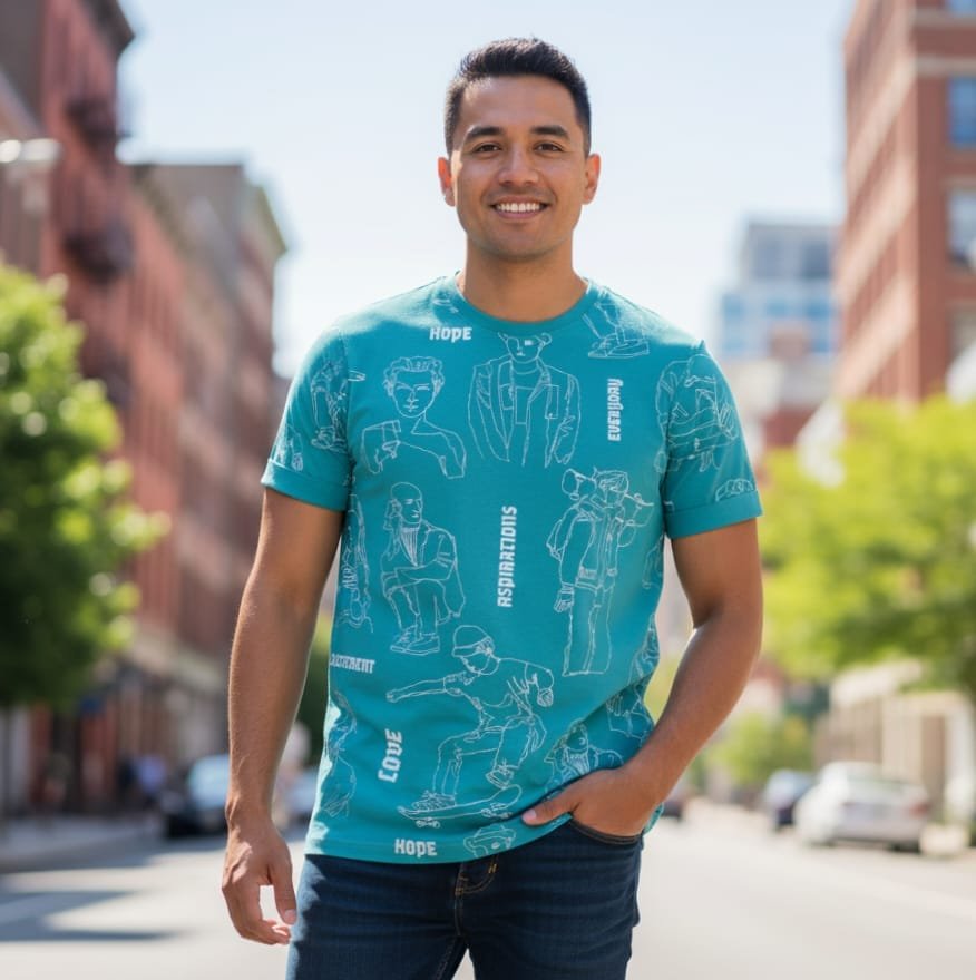 This U.S. Polo Assn. t-shirt is a unique and expressive piece with an urban feel. The vibrant teal base is covered in an all-over, subtle white line-art print of various characters and scenes, accompanied by empowering words like “LOVE,” “HOPE,” and “ASPIRATIONS.” This intricate design adds a personal and artistic touch to the shirt.