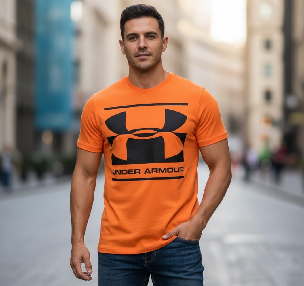 This Under Armour t-shirt is a bold and iconic piece, perfect for both athletic and casual wear. The vibrant orange body provides a striking backdrop for the oversized Under Armour logo in black, which is prominently displayed across the chest. The classic ‘UNDER ARMOUR’ wordmark is printed below, emphasizing the brand’s signature style.