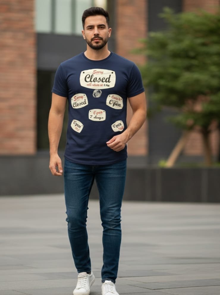 This Vintage t-shirt is a playful and unique piece that captures an urban, quirky style. Set on a dark navy background, it features a collection of stylized “Sorry, Closed” and “Open” signs in various shapes and fonts, creating a collage effect across the chest. The distressed, vintage-inspired graphics add a relaxed and lived-in feel to the shirt.